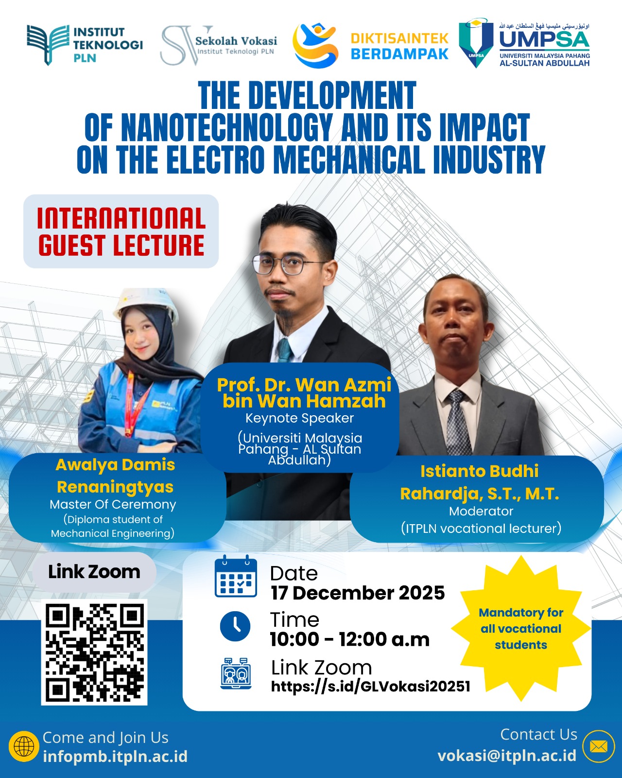 JAKARTA — Sekolah Vokasi Institut Teknologi PLN (ITPLN) menghadirkan kuliah tamu internasional bertajuk “The Development of Nanotechnology and Its Impact on the Electro Mechanical Industry” melalui skema International Guest Lecture yang digelar secara daring.